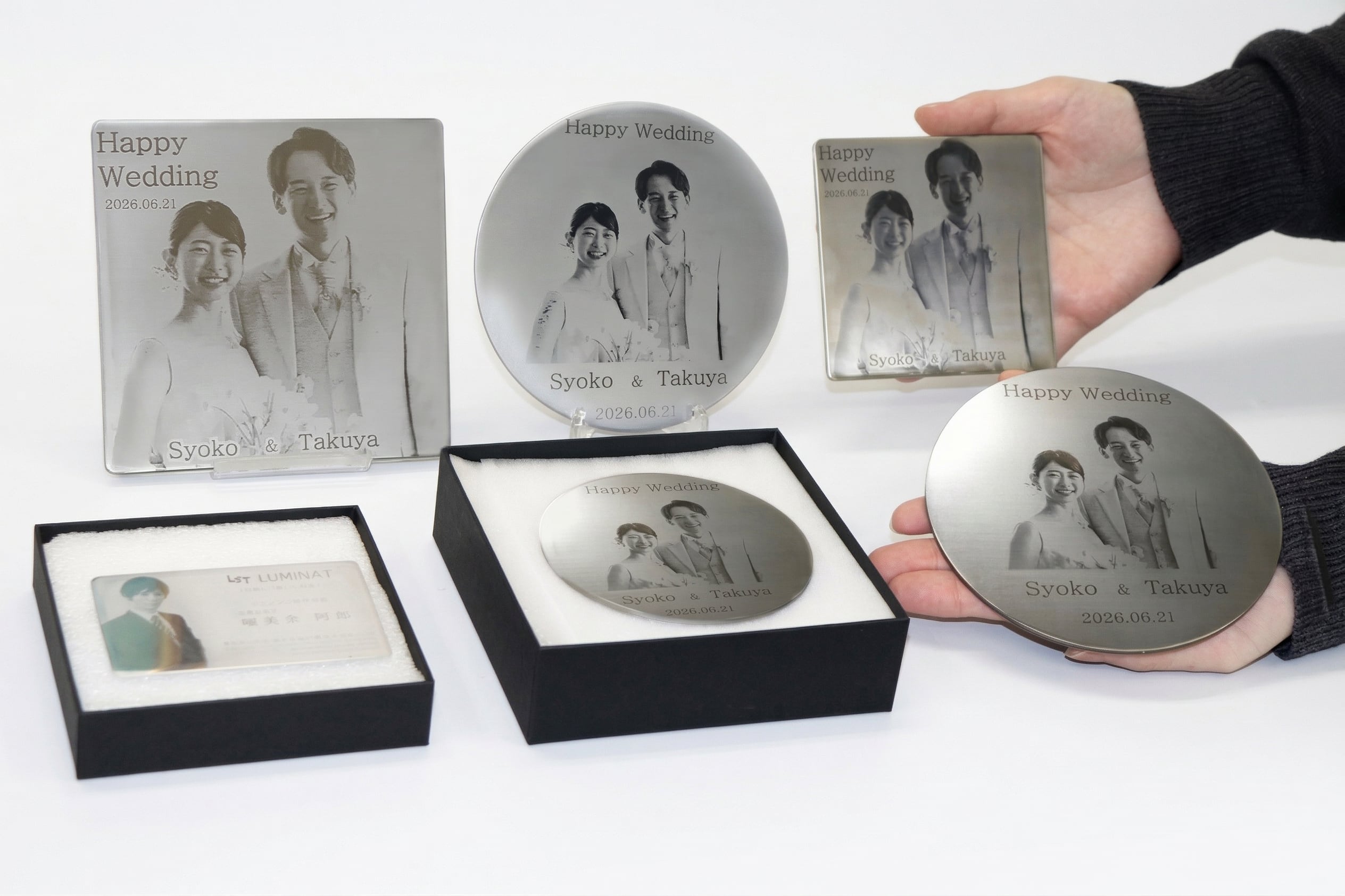 LIMINA-T(ルミナート)は、思い出を形に残る「宝物」とすべく、金属(ステンレス・アルミ)に写真や文字を刻印したギフト用の商品です。