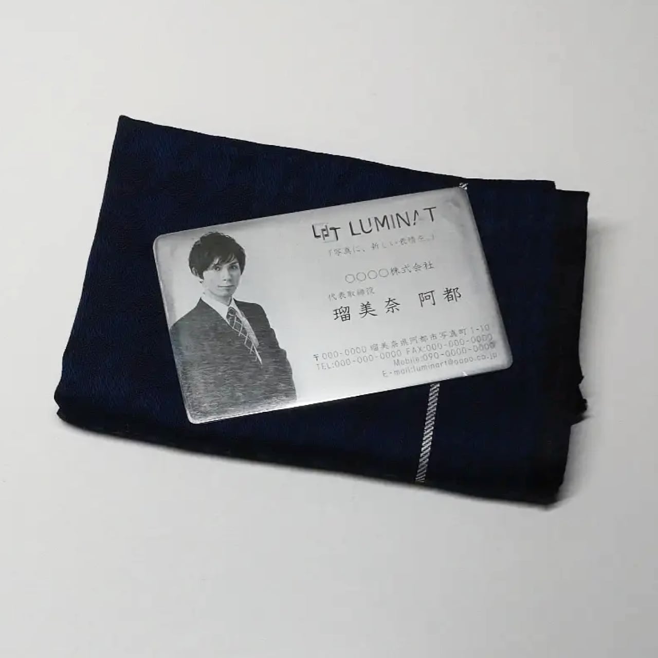 この金属カードは、名刺や財布にスマートに収まるサイズで、日常使いにも適したデザインとなっています。